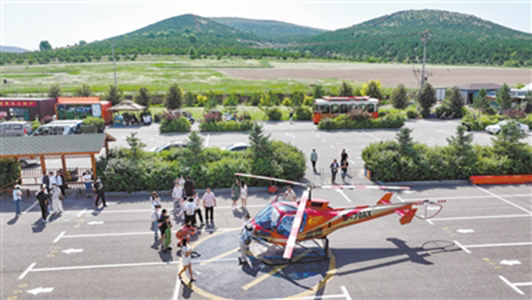 当直升机轻轻升至高空,通过飞机的透明舷窗,游客可尽享大同火山群国家地质公园自然美景。6月17日,记者在狼窝山看到,空中看火山低空旅游项目十分火爆,游客众多。