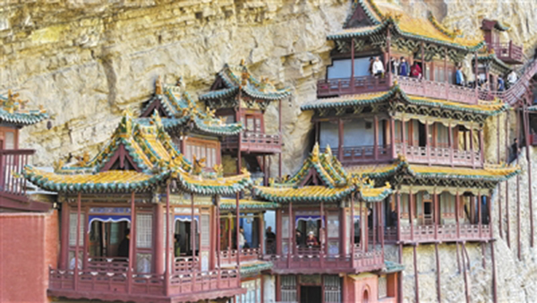 大同古城内的华严寺、善化寺为国内目前仅存八大辽构的其中之二。华严寺的大雄宝殿建筑面积达1559平方米,是我国古代宗教单体建筑中最大者,虽经历近千年,仍稳健而坚固,古朴而庄严,雄伟而壮丽;大雄宝殿的屋脊上有两对巨大的高4.5米的琉璃鸱吻,是中国现存最大的鸱吻;薄伽教藏殿内设有一座天宫楼阁,构造精巧绝伦,被梁思成称为“海内孤品”。善化寺是中国现存规模最大、最为完整的辽金时期建筑之一,亦是国内唯一拥有3座庑殿顶建筑的寺院,同时还保存了4座辽金建筑,具有极高的历史和文化价值。位于北岳恒山脚下的悬空寺始建于北魏时期,被誉为“全球十大最险建筑”之一,明代旅行家徐霞客在《徐霞客游记》中记载“西崖之半,层楼高悬,曲榭斜倚,望之如蜃吐重台者,悬空寺也。仰之神飞,鼓勇独登。入则楼阁高下,槛路屈曲。崖既矗削,为天下巨观。”在古都大同,让人流连驻足的古代建筑杰作还有很多,如元代古建关帝庙、明代鼓楼以及天镇慈云寺、浑源永安寺、阳高云林寺等。