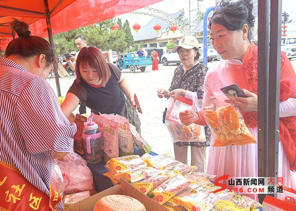 活动当天,谢店村广场彩旗猎猎,人声鼎沸。16家农业龙头企业携130多种“大同好粮”特优农产品惊艳亮相。金灿灿的大同黄花整齐摆放,在阳光下靓丽夺目。大同好粮推介人员热情地向村民介绍:“这些黄花经过精心晾晒,肉质厚实,营养丰富,不管是凉拌还是炖汤,滋味都绝了!”在各类杂粮摊位前,小米颗粒饱满,如裹着阳光的金砂;糕面、莜面、豆面品种齐全,散发着五谷之香,引得村民们纷纷驻足、咨询、购买。休闲食品区更是人气十足,杏脯、杏干、沙棘糕酸甜诱人。工作人员吆喝道:“老手艺制作,越嚼越香,快来尝尝!”杏汁、沙棘汁橙黄透亮,在阳光下折射出诱人光泽,清甜果香与醇厚酸甜味交织,不少人品尝后,竖起大拇指赞扬,有的直接买下整箱。书画展区内,本地书画家笔走龙蛇,金黄谷穗、麦浪翻滚的丰收图景跃然纸上。
