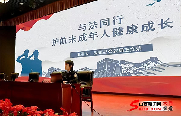 民警现场说“法”,预防青少年违法犯罪。天镇县公安局法制室四级警长王文婧向全体参会人员作“与法同行 护航未成年人健康成长”主题宣讲。宣讲从以案释法、分析原因、应对措施三个方面,通过极端暴力犯罪、电信诈骗和危害社会安全管理等方面的现实案例、身边案例,分析未成年人违法犯罪发生的原因,分享探讨切实保护未成年人、共创平安校园,学生怎么做、学校怎么做、家庭怎么做、公安怎么做,提出校园安全防范工作的策略和思考。