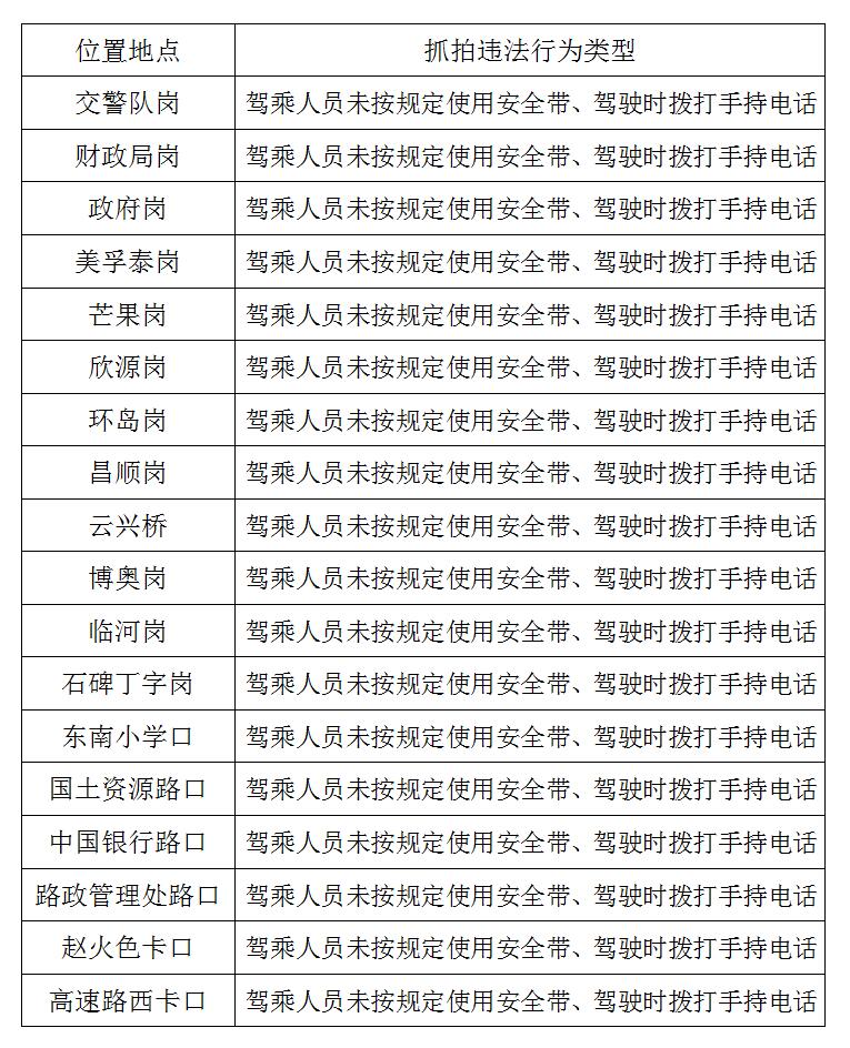 为了进一步规范大同市左云县道路交通秩序,有效遏制道路交通事故的发生,减少道路交通违法行为,净化道路交通环境,根据《中华人民共和国道路交通安全法》及其实施条例以及公安部《道路交通安全违法行为处理程序规定》要求,左云县公安局交通警察大队决定启用以下18处交通违法电子抓拍设备。将对驾乘人员未按规定使用安全带、驾驶时拨打手持电话的违法行为进行自动抓拍取证并依法实施行政处罚。