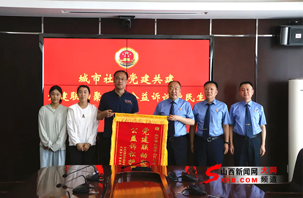 近日,大同市平城区永泰街道负责人、永昌里社区负责人将一面印有“党建联动聚合力 公益诉讼解民忧”的锦旗送到大同市人民检察院,对市检察院积极沟通协调,高效推动清理辖区一处堆积10余年之久的固体废物,表示赞扬和衷心感谢。