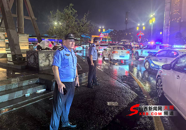 8月15日晚,大同平城区古城骤降暴雨,倾盆雨幕瞬间笼罩街巷,打乱了古城夜游的静谧。风雨交加中,一抹抹藏蓝身影始终挺拔——平城公安的民辅警顶风冒雨,用坚守与担当为游客筑起“安全屏障”,成为暴雨中最动人的风景。