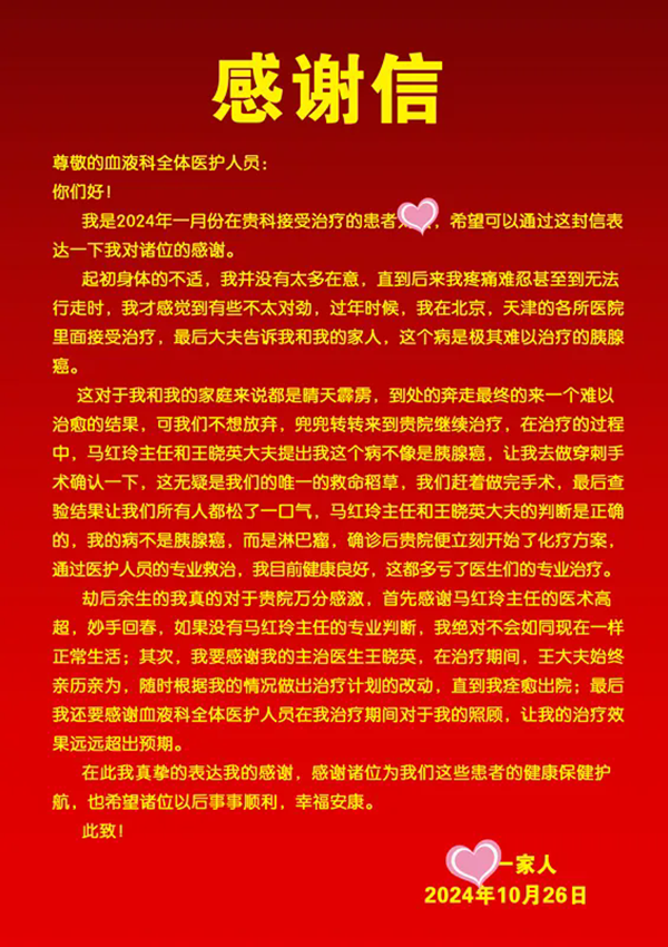 患者及家属为表达感激之情送上了感谢信,不仅是对医护人员辛勤付出的真挚回报,更是对医院百年传承的医院文化建设的认可和赞誉。这封信见证了医院全体人员传承百年精神,团结一心、攻坚克难的壮丽篇章,深刻体现 了医院文化中关爱患者、尊重生命、追求卓越的核心价值观。