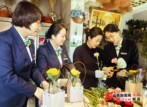 “今天来办理业务还拿到了鲜花,真是意外的惊喜,你们真贴心。”“谢谢你们的鲜花和祝福,让我真切地感受到了节日的快乐,很暖心。”一些前来办理业务的女士说。简单却真诚的话语,收到鲜花时的微笑,让整个营业厅洋溢着欢乐的节日气氛。在“三八”节这一天,营业部为为前来网点办理金融业务的女性客户赠送一枝鲜花,并送上最诚挚的问候和衷心的祝福。同时各营业网点派出“送花使者”为在社区、校园、企业等单位工作的女同胞亲手送上鲜花,祝愿她们像花儿一样美丽,永远健康,永远快乐。