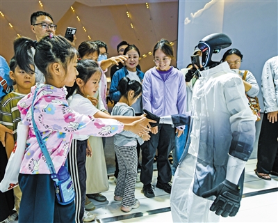 “哇,太帅啦!”在华为展区AI×AR全息互动区,伴随着同学们的惊呼和掌声,通过AI赋能,他们一位手握折扇男老师的AR全息影像,瞬间化身成风度儒雅的古代翩翩公子,周围其他观众也纷纷注目,感叹现场近在咫尺的科技感;在B展区,来自中国联通的格物小智3号和中国移动的“机器狗”形机器人产品,成为不少亲子家庭特别关注的焦点,好奇地上前观察互动。