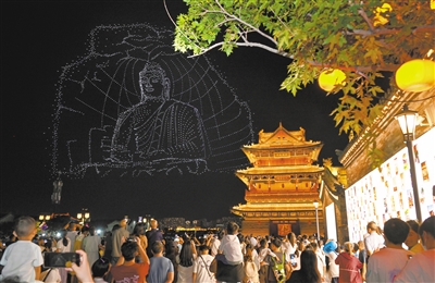 今年暑期,大同古城游人如织,8月中下旬,连续十余天,在代王府上空,5000架无人机以璀璨星空为幕,将古都厚重历史与现代科技完美融合,绘就出一幅幅璀璨画卷,刷新夜游新高度,展现如梦如幻魅力。张燕伟 于宏 摄