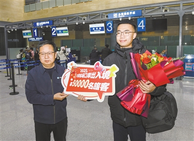 2025年,在市委、市政府的大力支持下,大同云冈国际机场持续加密国际及地区航线网络,在稳定运营2024年开通的“大同=曼谷”航线基础上,新增香港、乌兰巴托、莫斯科、首尔等直飞国际及地区航线,构建起多元化的国际(地区)空中通道,全面提升大同市对外开放水平,助力加速融入“一带一路”建设。与此同时,免签政策落地为大同机场航空口岸带来发展黄金期,便捷的航线网络不仅为文旅交流、商务考察、投资兴业搭建起高效通道,更推动了口岸客流持续攀升。当天,旅客罗先生成为云冈国际机场2025年第5万名出入境旅客。“感谢大同云冈国际机场的周到服务与暖心惊喜,祝愿大同的航线越飞越广,大同的发展越来越好!”罗先生激动地说。