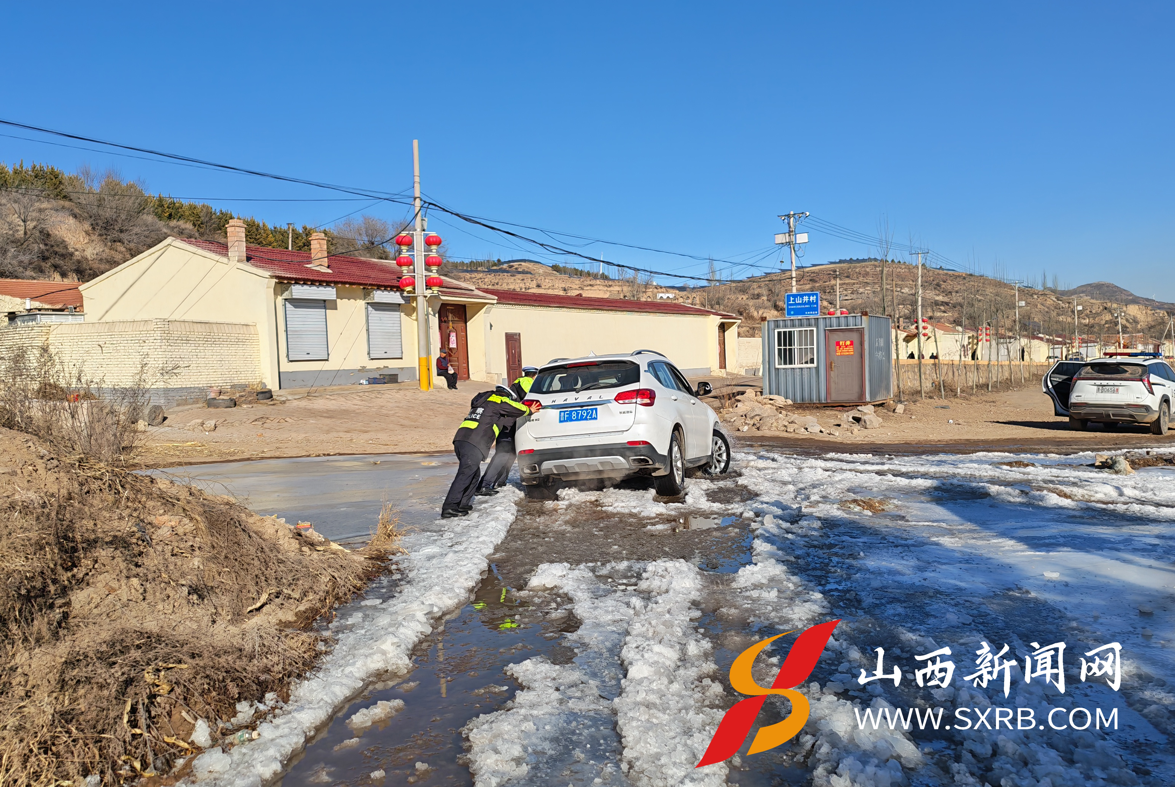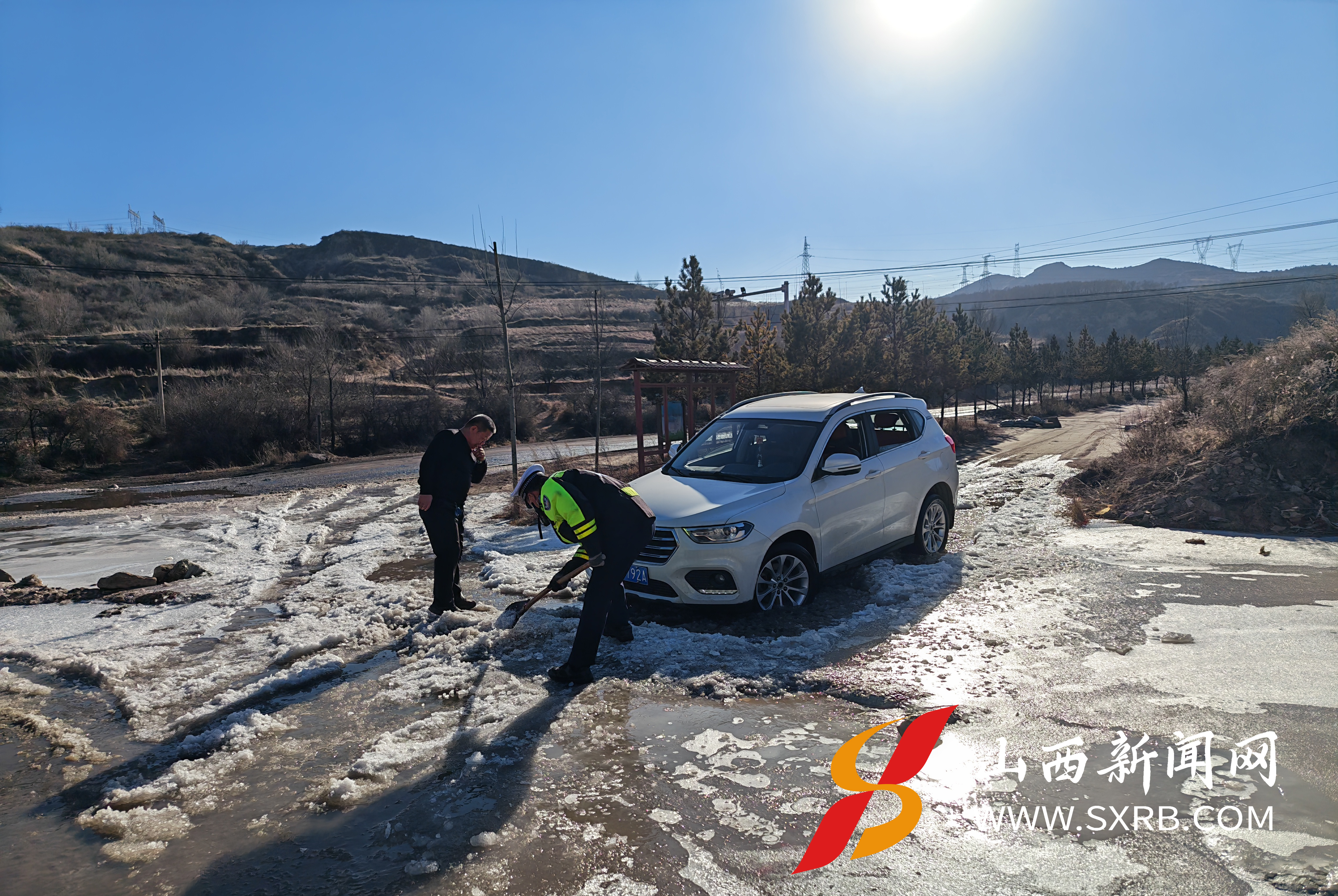 12月4日16时30分,大同市左云县公安局交通管理大队张家坟中队民警按既定路线开展日常巡逻。当巡逻至下山井村附近路段时,民警发现一辆晋F牌照的小型车辆因路面结冰打滑,不慎被困冰面,无法正常行驶。