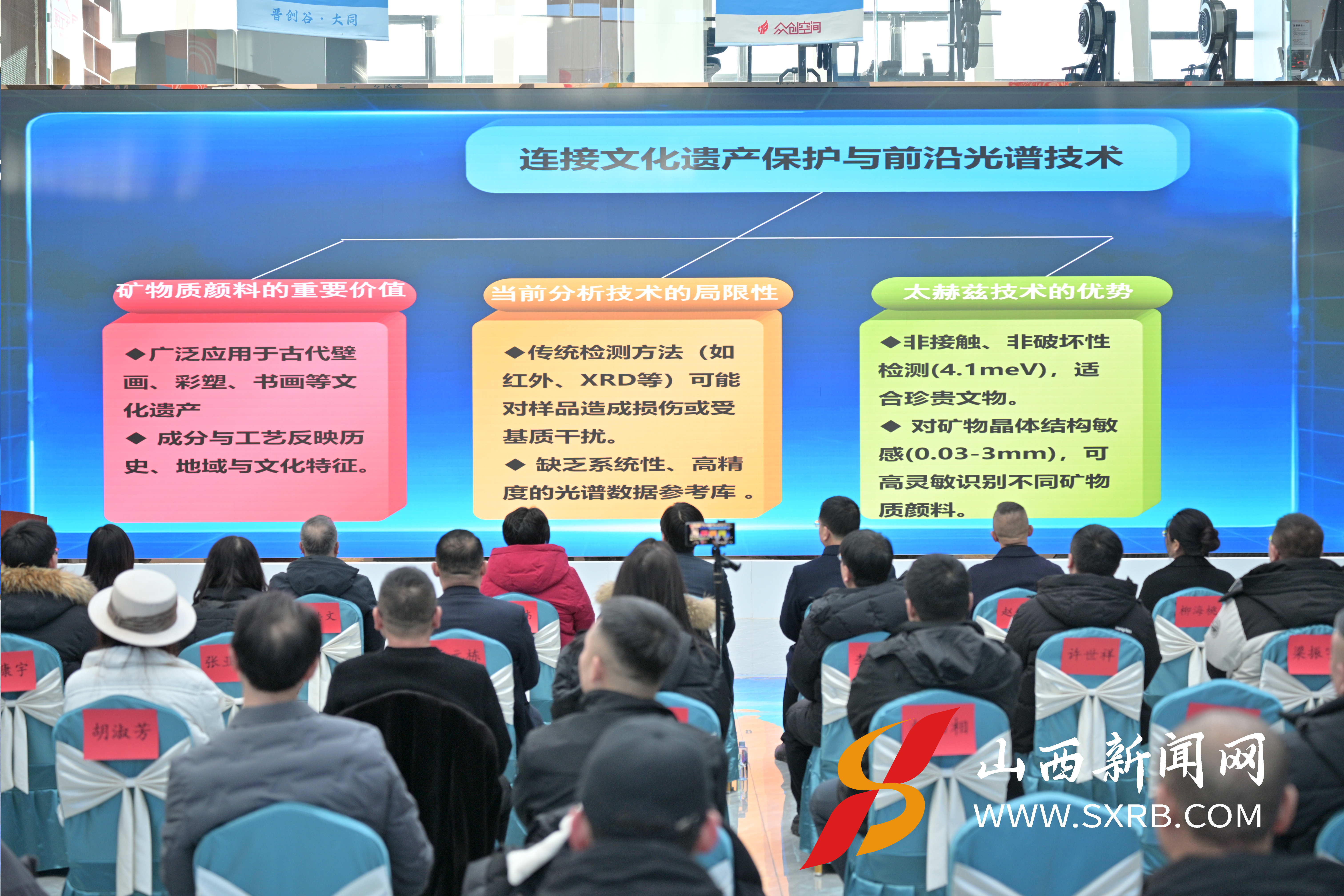 据介绍,太赫兹波位于微波与红外波之间,是电磁波谱中研究较少、开发较晚的波段,太赫兹技术被誉为“改变未来世界的十大技术之一”。太赫兹波兼具无损穿透性、指纹谱特异性和低光子能量的独特优势,就像一束“穿越时空的透视光”,能在不触碰文物的前提下,精准捕捉颜料的分子结构特征。这一优势使其在重大考古项目中已崭露头角,如三星堆出土青铜器锈层测量的三维层析成像分析、西安秦兵马俑2号坑文物的精准探测等。近年来,山西大同大学固体物理研究所与绿象太赫兹科技(山西)有限公司合作团队深耕太赫兹技术在文物科学领域的研究,构建校企合作实验室,克服重重困难,最终构建起100种常用矿物质颜料的“太赫兹光谱字典”,该项目获得了跨学科专业团队的支持,特别是在北京理工大学太赫兹科学研究中心主任兼首席科学家胡伟东教授的指导下,合作团队稳步推进了矿物质颜料太赫兹光谱库的构建工作。该数据库在文物壁画颜料识别、露天文物病害检测、修复材料性能表征等方面有着重要意义和应用前景。