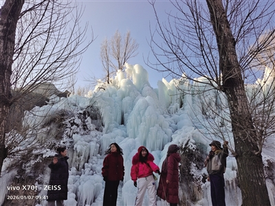 阳高秋林峪洁白晶莹的冰瀑从石壁纵贯而下,一团团、一簇簇,悬挂在山崖上,层层叠叠美不胜收,成为冬日里一道亮丽风景,吸引一波又一波市民游客拍照打卡,尽情感受冬游的乐趣。(崔莉英)