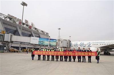该航线由东海航空执飞,班期为每周二、四、六,执行日期至3月13日。航班时刻为:DZ6231深圳9∶50起飞,13∶05抵达大同;大同13∶55起飞,15∶40抵达沈阳。DZ6232沈阳16∶40起飞,18∶50抵达大同;大同19∶30起飞,23∶00返回深圳。