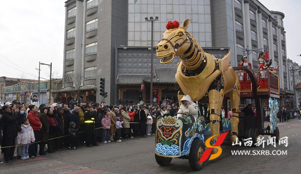 上午8时30分,备受万众期待的踩街盛典准时拉开帷幕。20支队伍沿着既定路线浩浩荡荡前行,彩车领航、方阵紧随,蔚为壮观的阵势,人山人海的场面,气势如虹、盛况空前,让这座千年古城瞬间春潮涌动、活力迸发。在东门主表演点,随着铿锵有力的锣鼓声响,踩街表演正式拉开帷幕,身着华服的表演者依次登场,威风锣鼓气势磅礴,旱船悠悠“划”过,秧歌欢快灵动扭起,彩扇翻飞如浪花绽放,红绸飘扬似火焰燃烧,表演者们踩着喜庆鼓点、和着欢快节拍,一招一式尽显风采。穆桂英霸王鞭刚柔并济、百鞭齐舞,气势如虹,北魏仪仗队庄重威仪,尽显历史风韵;极具地方特色的耍故事、踩高跷、跑旱船、非遗扇鼓、车车灯轮番上演,尽显本土非遗独特魅力。凉粉潮舞联盟携凉粉宝宝趣味互动,黄芪仙子方阵气韵不凡,笑傲江湖表演方阵英姿飒爽,机器人大队、机械巨马潮范十足,宇树机器狗灵动亮相,辽金服饰+木偶戏表演方阵古韵悠长,黄老芪、浪浪山小妖怪、大头娃娃萌趣出圈,千灯巡游流光溢彩,将满城喜庆与欢歌洒满古城街巷。